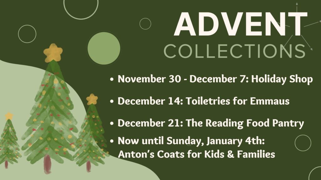 - From now until Sunday, January 4th – we are also collecting gently used adults’ and children’s coats for Anton’s Coats for Kids & Families project. The box for Anton’s coats will be outside the Chapel.