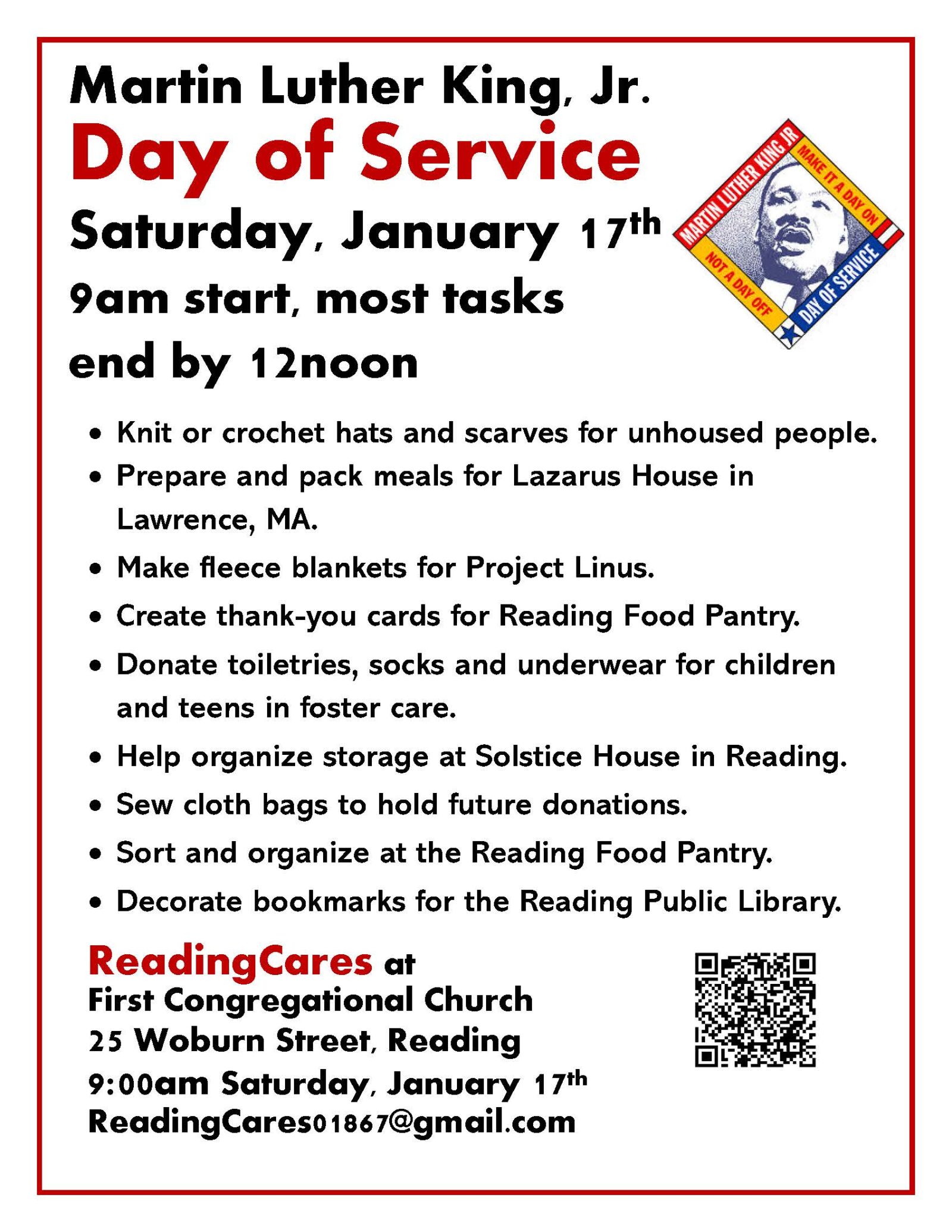 - Bring items to the Martin Luther King Jr. Day of Service (January 17th, 9am-2pm)