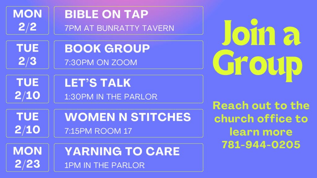 Women ‘n Stitches works on quilting and other needlework projects. Due to a snow cancellation, Yarning to Care will meet both February 2 and February 23. They recently completed a commissioned quilt with proceeds to benefit the church. Join them on every second Tuesday at 7:15 in room 17.