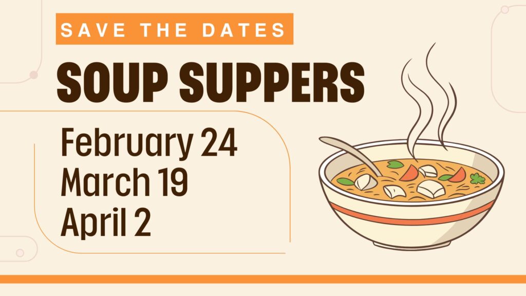 Potluck soup suppers keep us warm with good food and good fellowship this winter. Join us for dinner anytime between 6-6:30 PM. A program will follow each dinner at 6:30 PM (interactive program on 2/24, presentation on Assisi 3/17, and Maundy Thursday service on 4/2.)